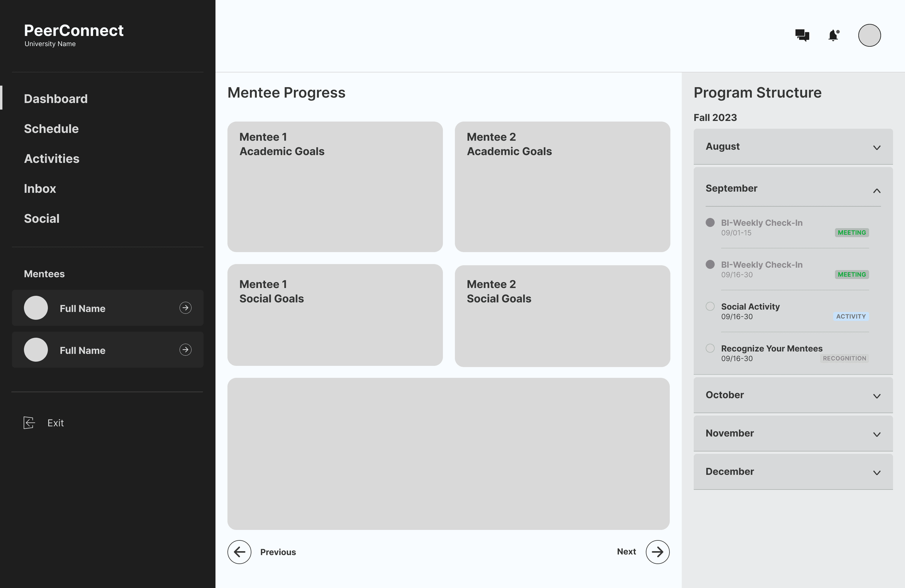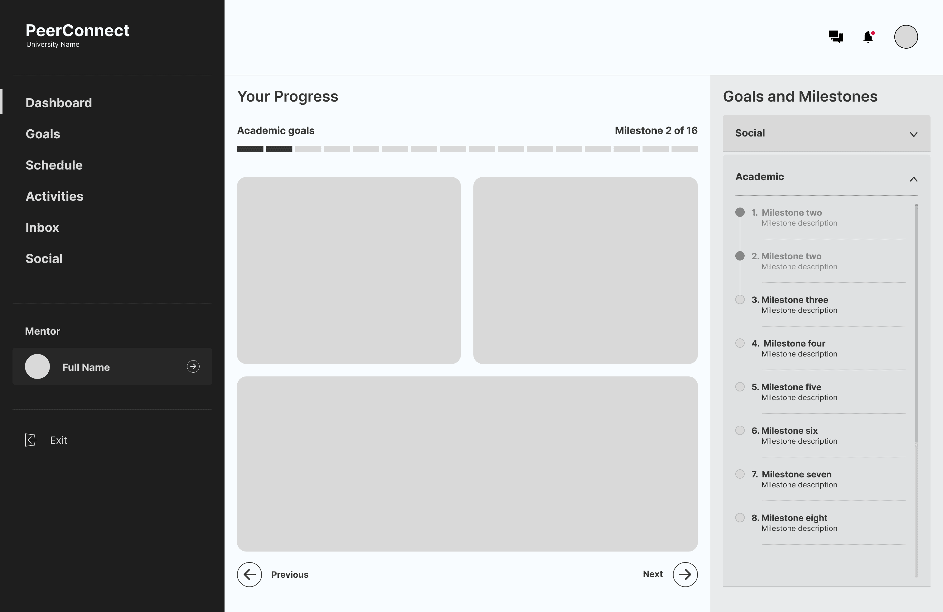 Through surveys and fundamental design principles of student-facing LAD, we came up with initial wireframe concepts for our upcoming co-design workshops.