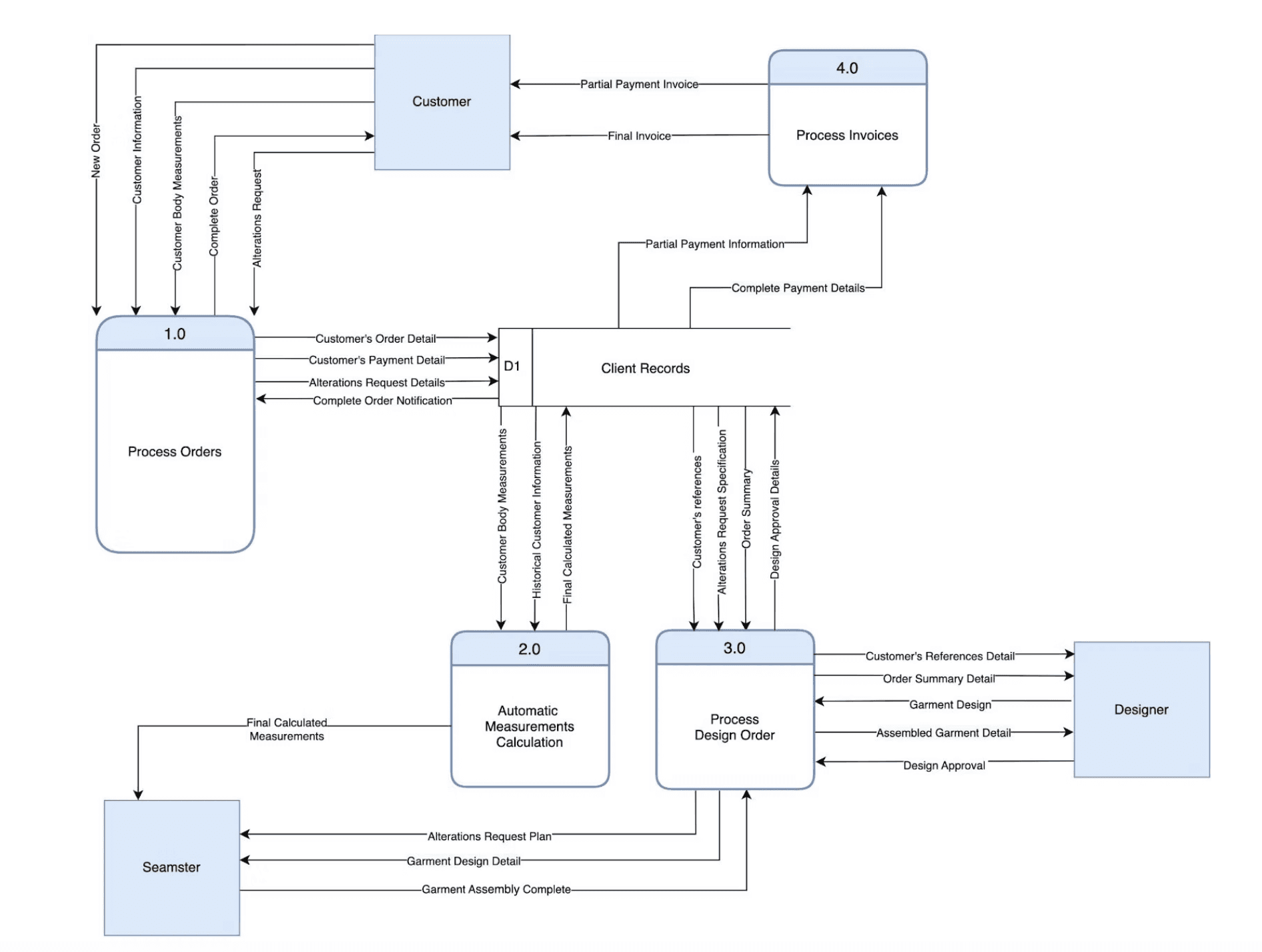 We designed a customized system with a centralized database tailored for T&B using draw.io. This solution handled customer orders, automates measurement calculations, manages garment design details, and prepares invoices - all accessible only to T&B employees. The image below shows a Level 5 Data Flow Diagram. This is how the data will flow through the system.