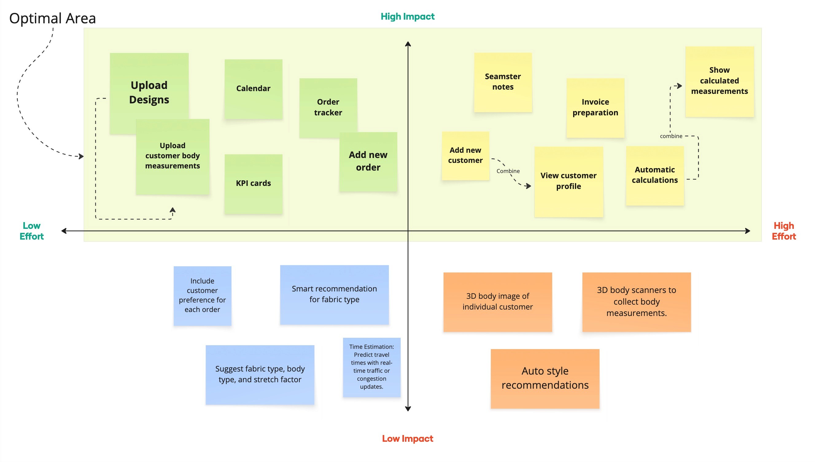 To effectively prioritize what features to build first, we created an Impact-Effort Matrix that helped us balance value and feasibility. In the top two quadrants, we focused on high-impact features which was our "do it now" zone. These included uploading designs, entering customer body measurements, and enabling automatic fabric calculations. These were the core features directly that addressed the business pain point. We also added basic order management features like viewing customer profiles and creating new orders, to streamline daily operations.
