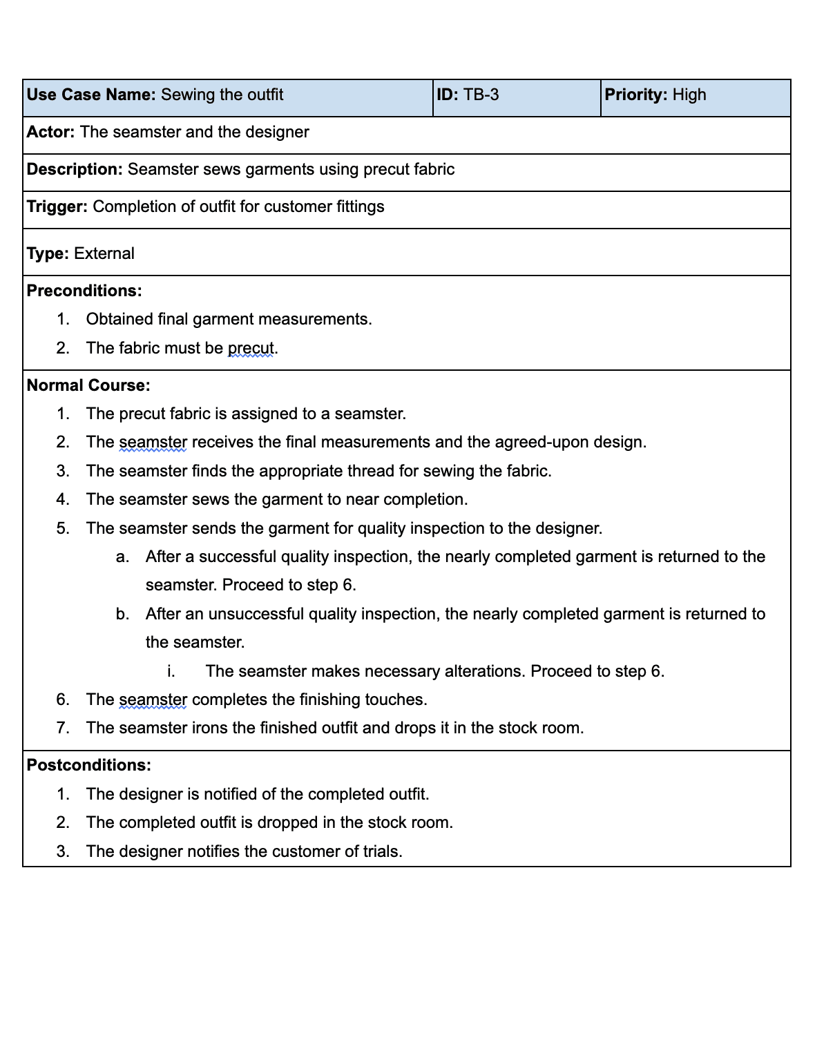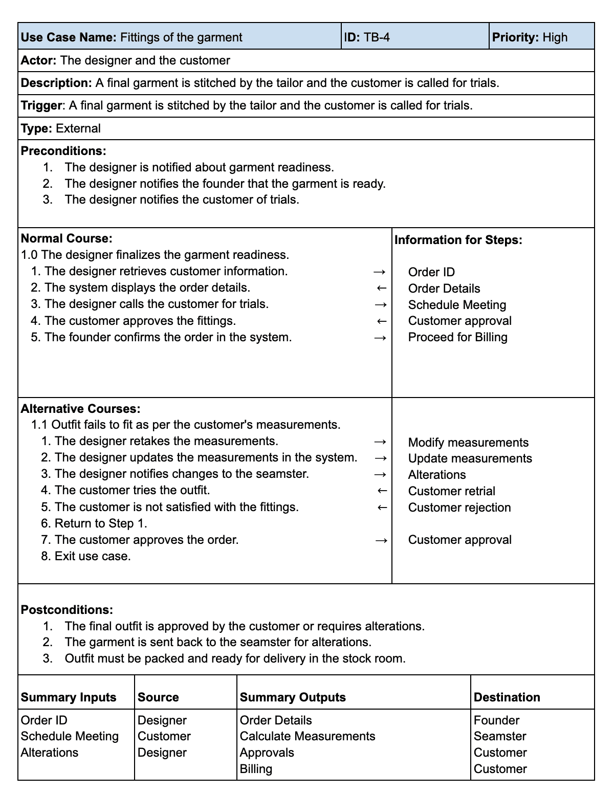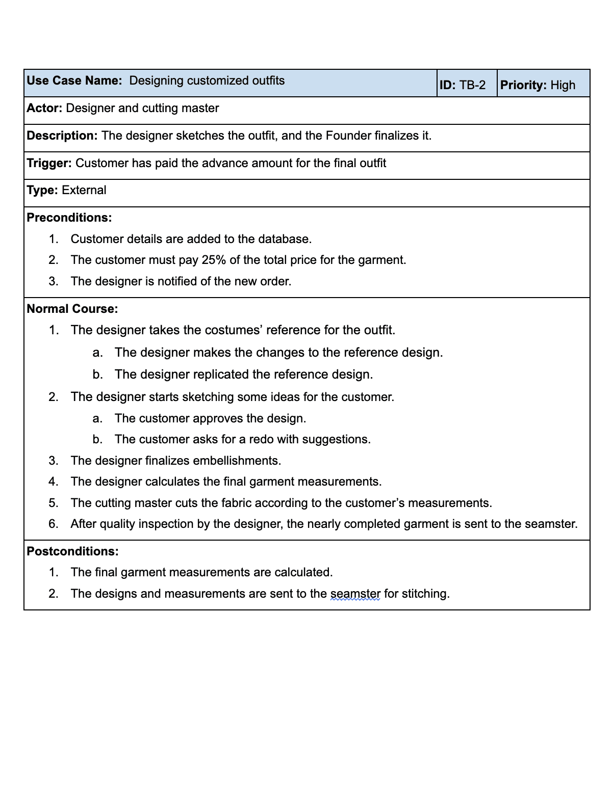 The proposed solution is a new customized software with a centralized database created specifically for T&B. The database will store data regarding new and old customer orders, calculate measurements automatically, display garment design details, and prepare invoices. Customer access to the system will be limited to T&B employees. The new software built will take body measurements as inputs and calculate the 2D garment measurements. The working of the software is discussed in detail in this document.