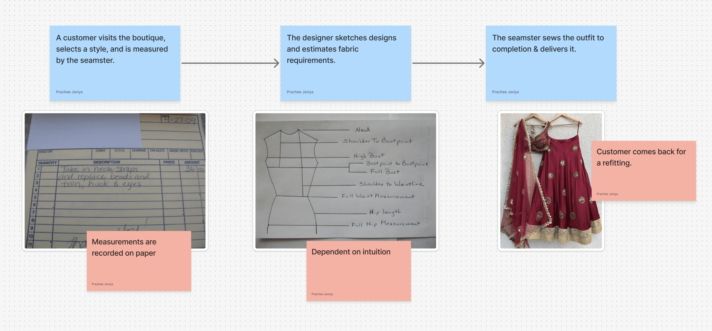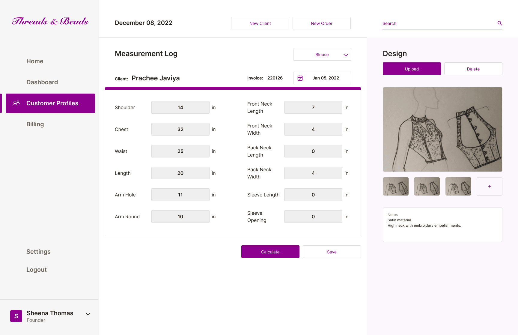 Threads & Beads manages customer data manually using paper records. This included customer details, body measurements, and delivery dates. Designers calculate garment dimensions manually based on intuition, as no standardized measurement method exists.